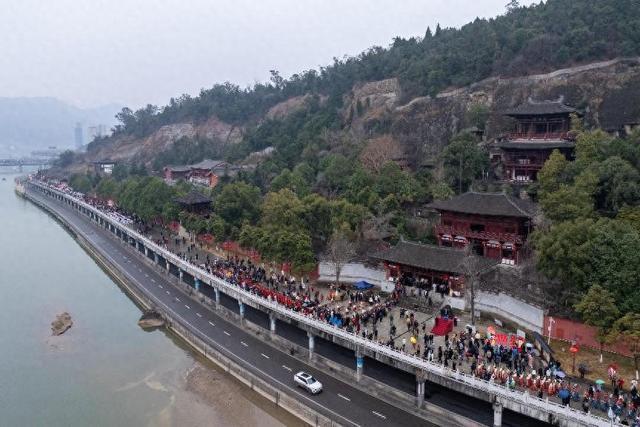 2月20日,在利州区嘉陵江两岸(皇泽寺到凤翔楼的沿途),百名身着唐风汉服领舞人员和前来游玩的群众共同欢乐踏歌,以一曲《女儿河》为“正月二十三·女儿游河湾”群众文化惠民活动增添了一抹绚丽的传统文化色彩。